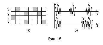 3. Адрес абонента формируется из элементов (обозначенных на рисунке 15а) заштрихованными квадратами, определяющими частоту заполнения и время передачи импульсов адреса. Примеры адресов приведены на рис. 15б. Видно, что адреса представляют собой группы радиоимпульсов, имеющие разные частоты заполнения и время передачи.